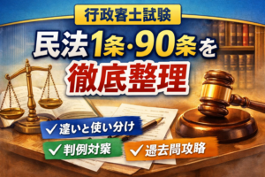 違い・使い分け・過去問対策まで 行政書士試験の民法では、「民法1条なのか、90条なのか」で迷う受験生が少なくありません。どちらも一般条項として重要ですが、条文の趣旨や使われ方は大きく異なります。違いを曖昧なままにしている […]